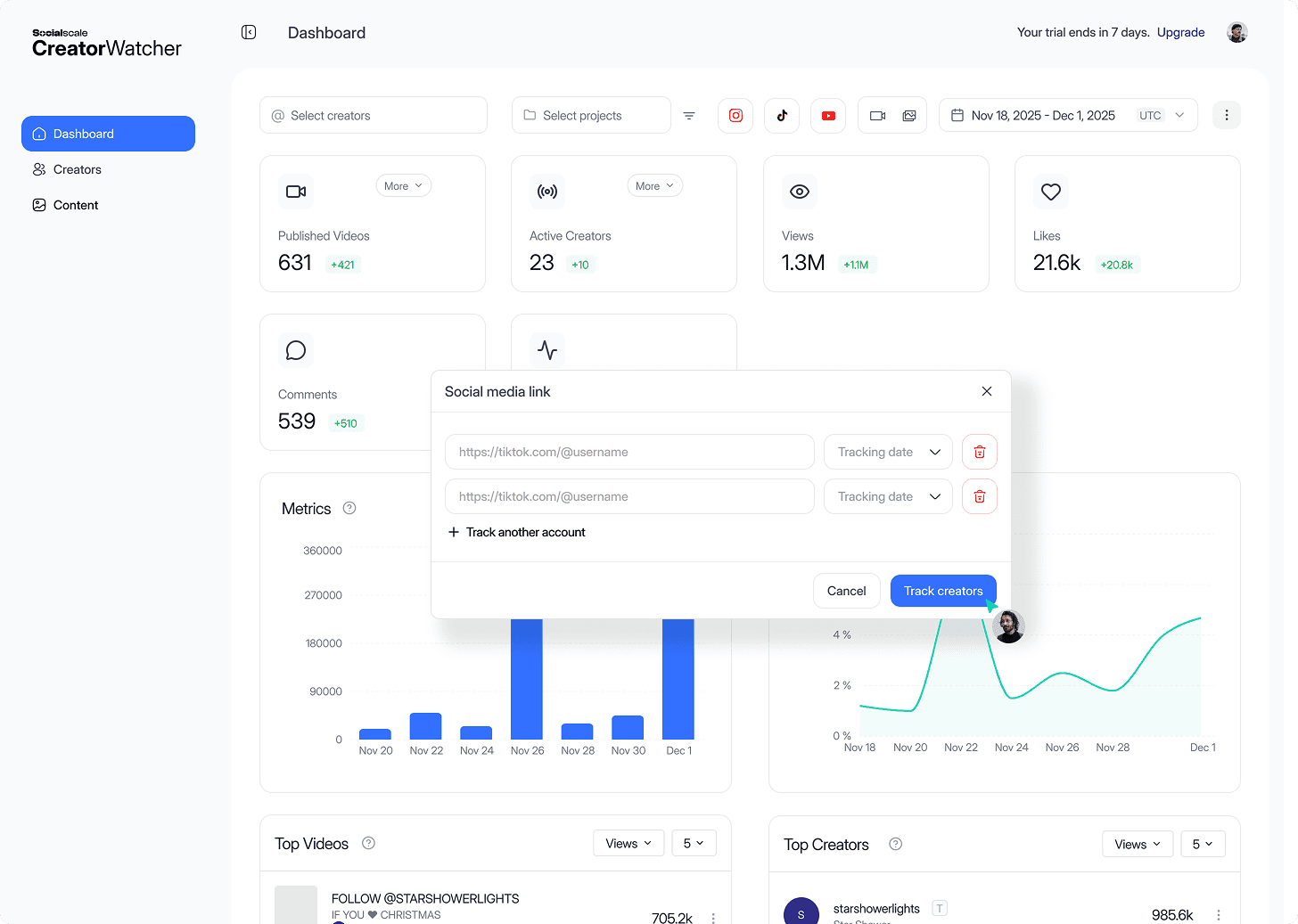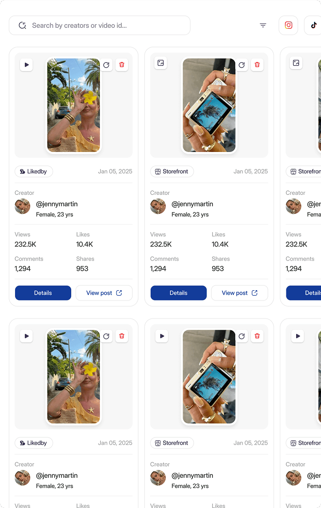 Add any social media account — from your brand, creators, competitors, or even a single video — and start tracking daily performance instantly.